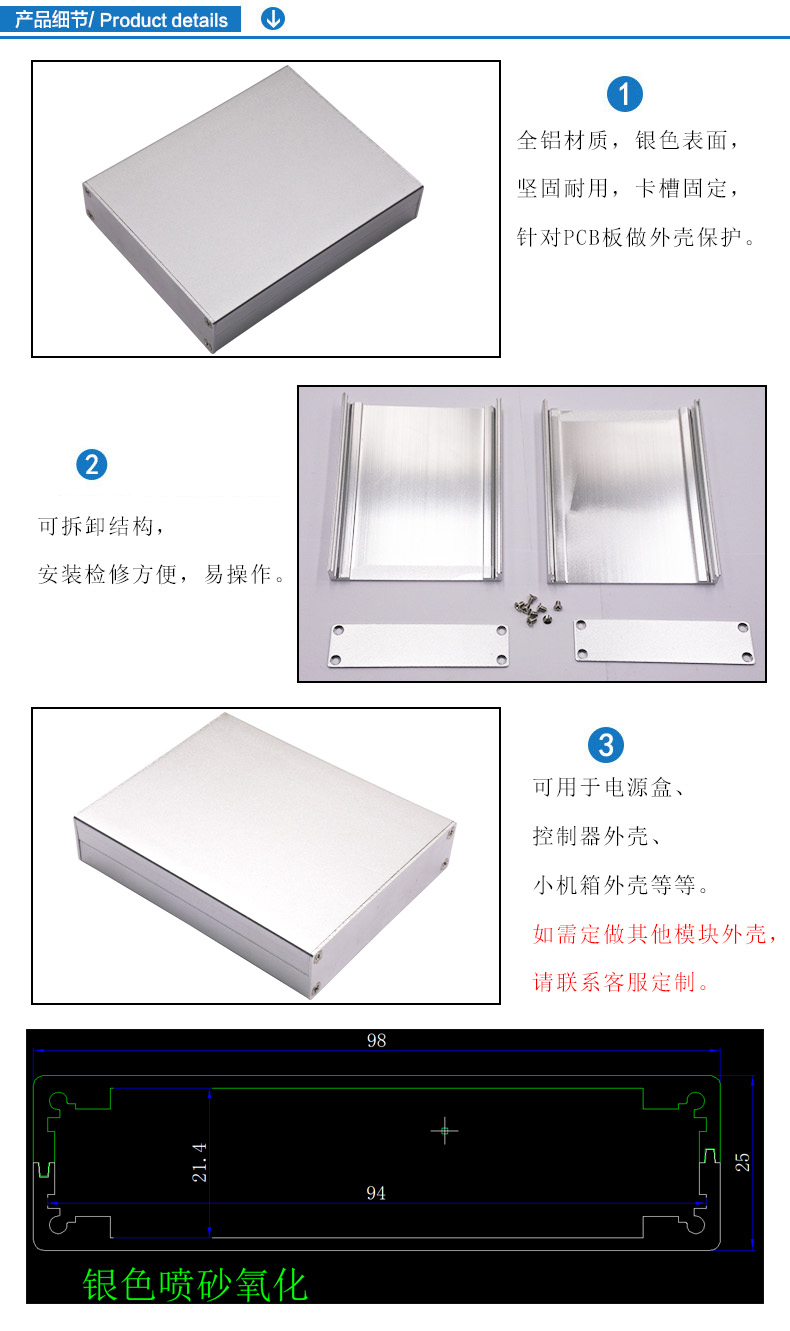 名稱:鋁型材外殼、控制器外殼、通信類外殼 表面:銀色噴砂氧化 尺寸:120*98*25mm 標品圖號:GEM-Z032-GEM01A 特點:1.全鋁材質,銀色表面,堅固耐用,卡槽固定,針對PCB板做外殼保護。 ? ? ? ? ?2.上下蓋結構,安裝拆卸方便,易操作。可用于電源盒、控制器外殼、小機箱外殼等。 其他:如需定做其他模塊外殼,請聯系客服定制。