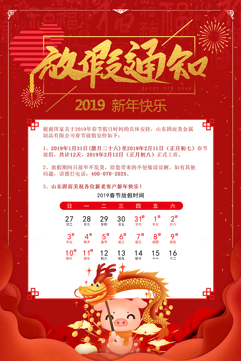根據(jù)國家關(guān)于2019年春節(jié)假日時間的具體安排,山東固而美金屬制品有限公司春節(jié)放假安排如下: